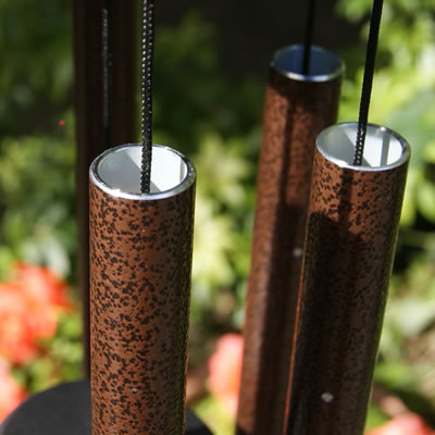 Jedes handgefertigte Klangspiel ist erhältlich in verschiedenen Designer-Farben: Kupfer ist ein texturiertes braunes Finish mit dunkleren Adern. Die reflektierende Oberfläche glänzt schön auch im Licht.